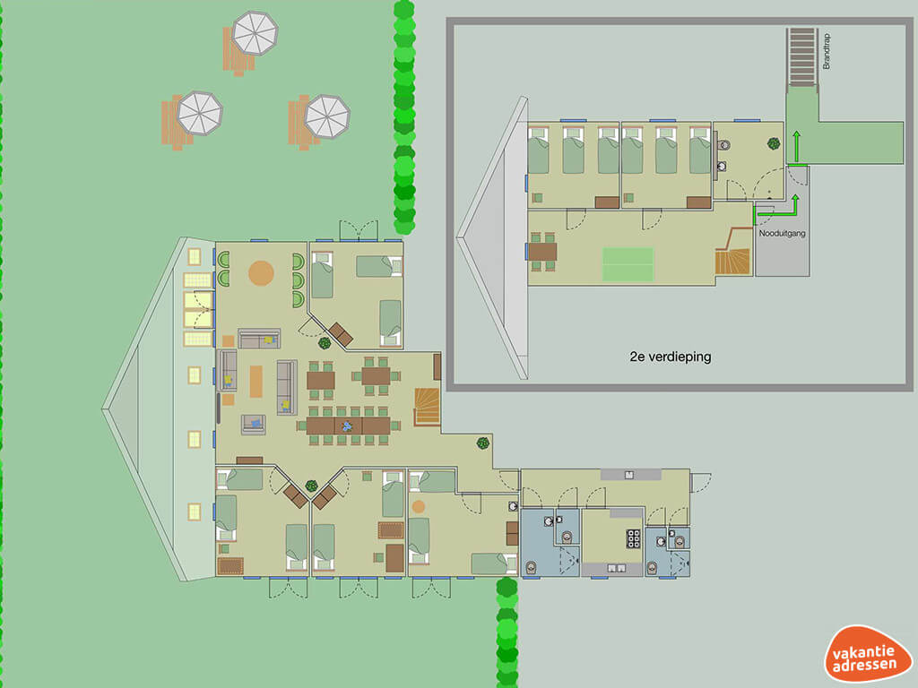 Dit vakantieadres op de Hondsrug in Drenthe is geschikt voor 10 tot 18 personen en voorzien van 6 slaapkamers. De openhaard met zijn knapperend houtvuur zorgt voor veel gezelligheid in de recreatieruimte voorzien van zit- en eetgedeelte. In het eetgedeelte kunt u met uw gehele groep of familie gezamenlijk eten. Deze recreatieruimte heeft aansluitend een groot en gezellig terras met eigen tuin. De keuken is van alle gemakken voorzien zoals 5-pits fornuis met grote oven, magnetron, vaatwasser en voldoende koeling. Ook is er een recreatieruimte op de eerste verdieping met tafeltennis en een gezellige zithoek.