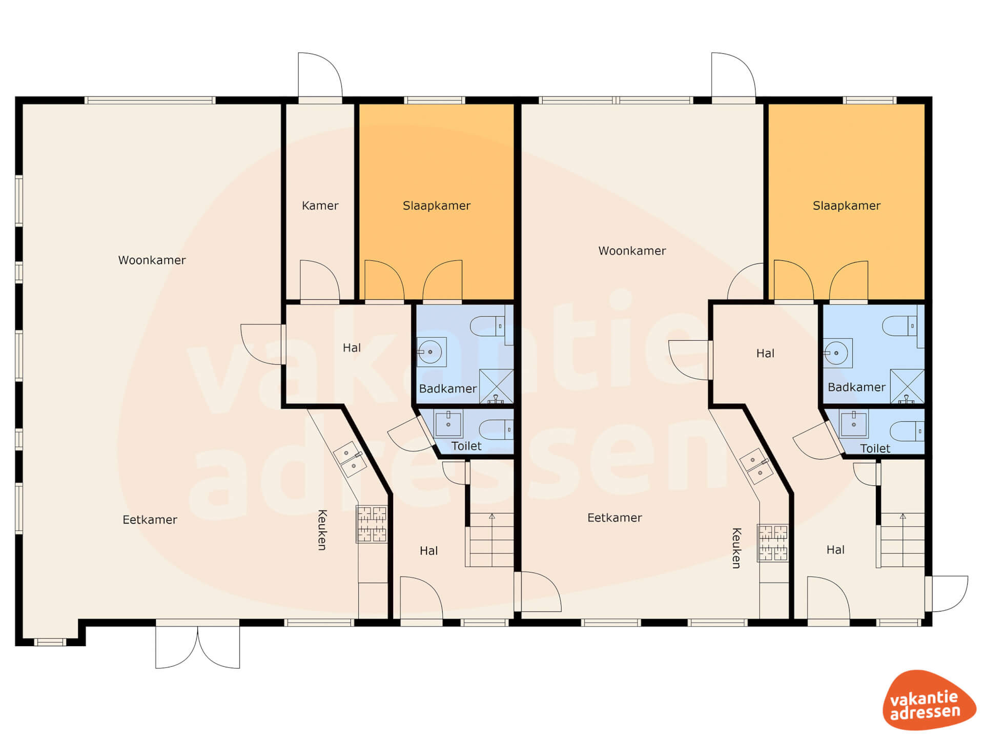 De accommodatie bestaat uit twee geschakelde 10- en 11-persoons vakantiehuizen. Ideaal als je met een groep weg wilt, maar tegelijkertijd ook je eigen privacy wenst. Beide vakantiehuizen beschikken over een eigen woonkamer, eettafel en volledig ingerichte keuken met o.a. oven, magnetron en vaatwasser. Je kunt met de gehele groep zowel binnen als buiten, samen aan tafel zitten.