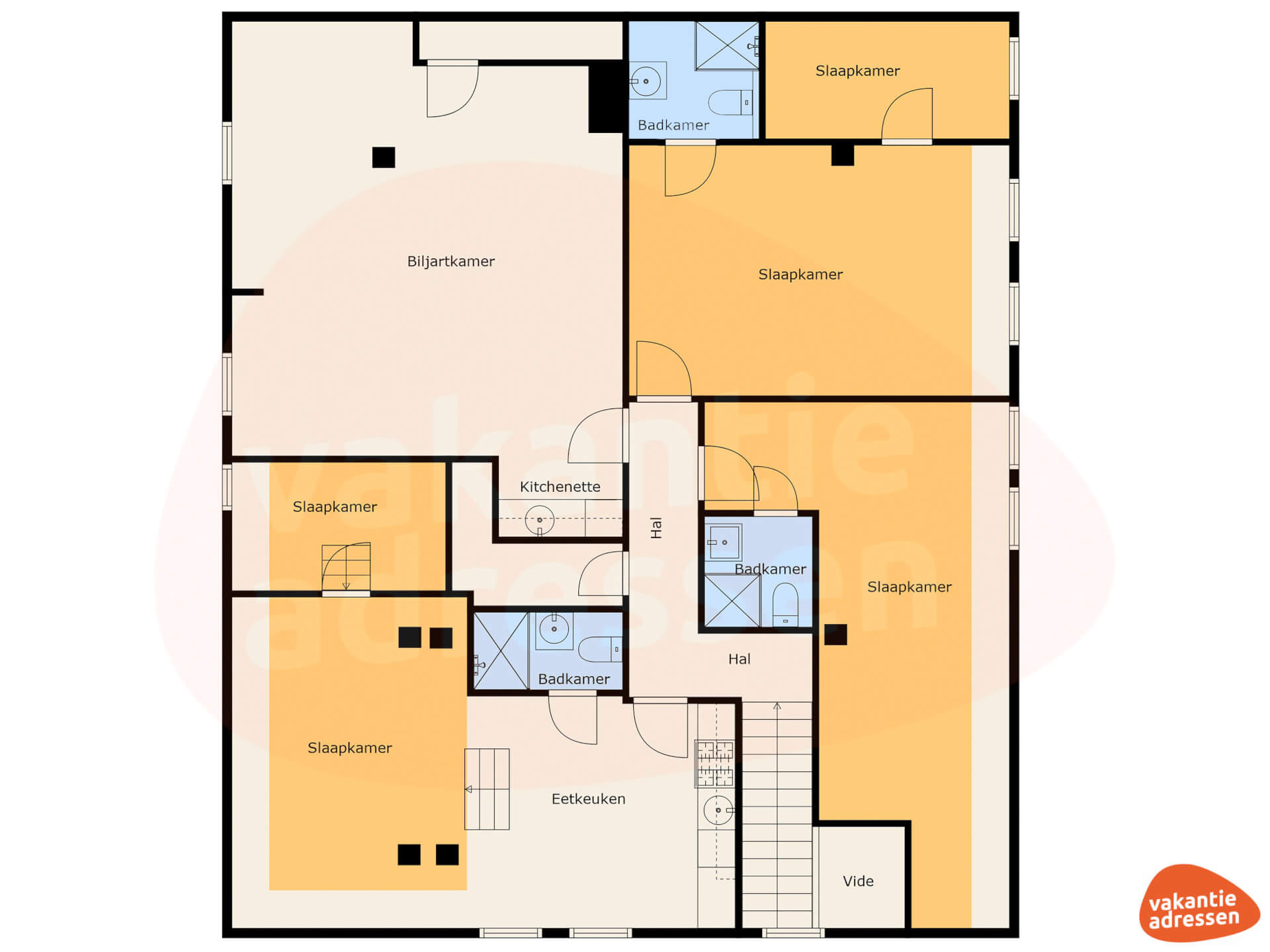 De accommodatie heeft 7 slaapkamers, waarvan er 5 voorzien zijn van een eigen badkamer met douche, toilet en vaste wastafel. Beneden is er een zeer ruime 2-persoonskamer met zithoek en schouw en met lichte aanpassingen voor senioren. Er bevindt zich op de begane grond tevens een 3-persoons appartement met zithoek, keukentje en extra eettafel. Boven zijn er nog 5 kamers: een 2-persoons, een 4-persoons familiekamer met aparte slaapkamer en een 4-persoons appartement met keukenblok en aparte slaapkamer met een 2-persoons bedstee.