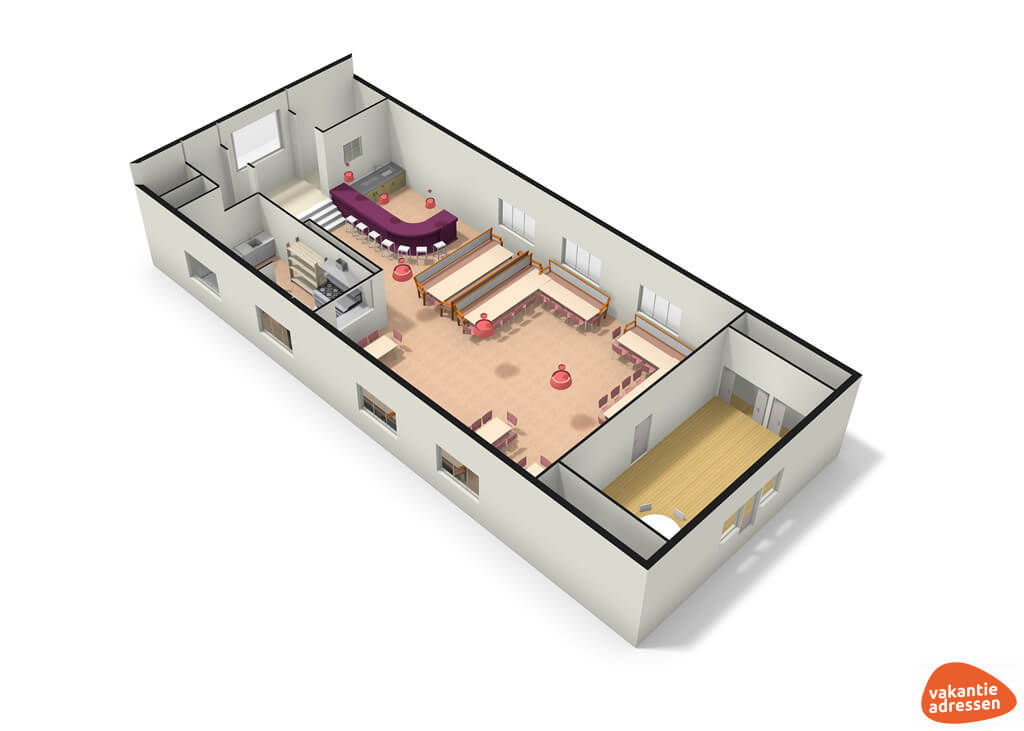 Op de verdieping beschik je over een grote gezamenlijke ruimte met volledig ingerichte keuken, bar met tapinstallatie, beamer en geluidsinstallatie. De keuken is ingericht om voor grote groepen maaltijden te verzorgen met onder andere een professionele vaatwasser en groot 6-pits gasfornuis. De gezamenlijke ruimte is gezellig ingericht voor een familieweekend, maar kan ook zo omgetoverd worden voor een groot feest.