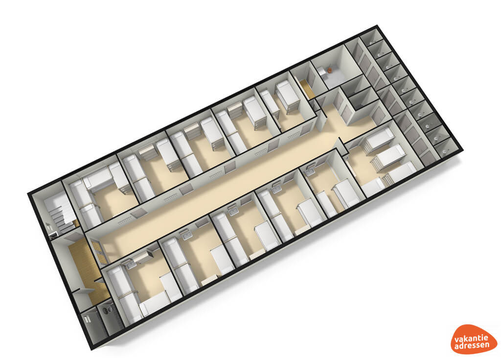 De 11 slaapkamers bevinden zich op de begane grond. Iedere kamer heeft een eigen wastafel. Op de gang vind je de 12 douches. Kussens zijn standaard aanwezig, dekbedden en bedlinnen kun je zelf meenemen, maar ook huren.