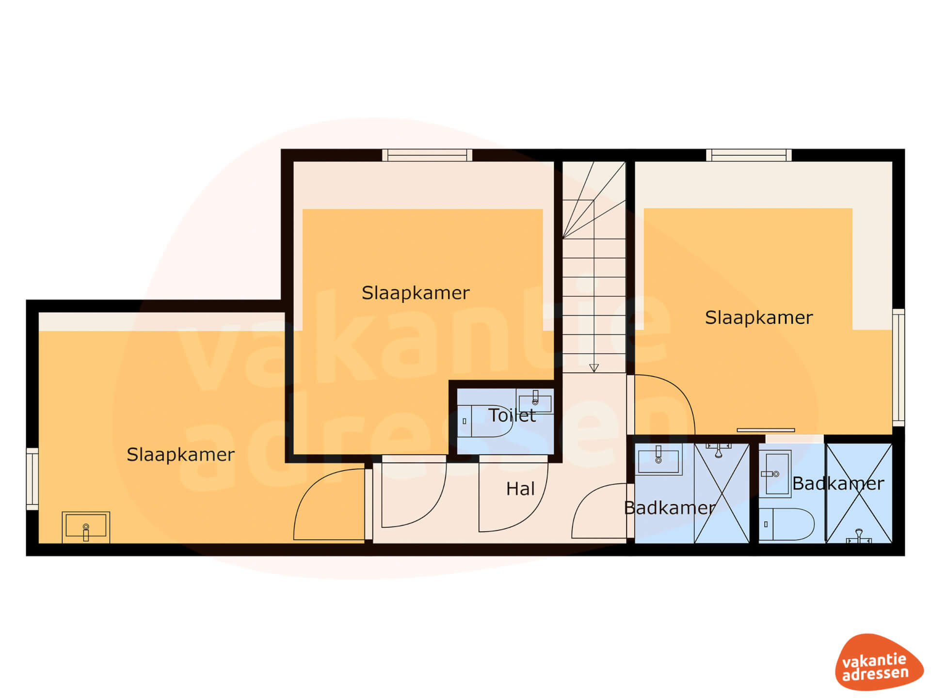Het vakantiehuis beschikt over vier ruime slaapkamers, verdeeld over de twee verdiepingen van het huis. Op de begane grond vind je een slaapkamer met een tweepersoonsbed en een privé-badkamer met douche, toilet en wastafel, ideaal voor extra comfort en privacy. Boven bevinden zich nog drie slaapkamers: twee met een 2-persoonsbed, waarvan één met een eigen badkamer. Naast de vierde slaapkamer met een 2- persoonsbed en een stapelbed (perfect voor gezinnen), bevinden zich ook een extra badkamer en een separaat toilet op deze verdieping.