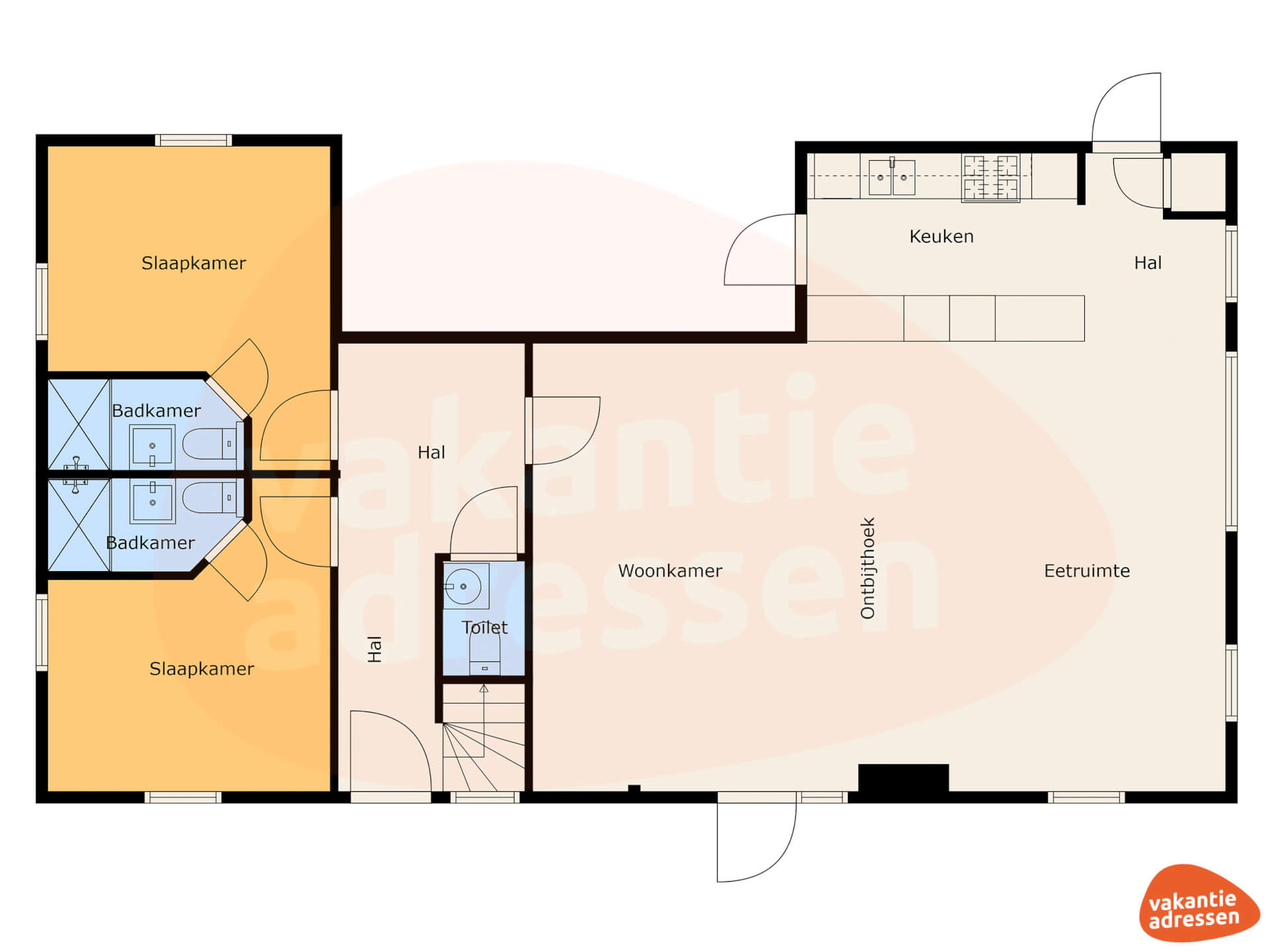 De 2 tweepersoons slaapkamers op de begane grond hebben een moderne ensuite badkamer met douche, toilet en wastafel. Let op: handdoeken zijn niet inbegrepen en dienen zelf meegenomen te worden. De overige 3 vierpersoons slaapkamers zijn te vinden op de eerste verdieping en beschikken tevens over een eigen luxe badkamer. Alle slaapkamers zijn ruim ingericht en voorzien van leuke details en comfortabele bedden. Overal is prachtige, natuurlijke lichtinval, terwijl de verduistering zorgt voor een optimale nachtrust.