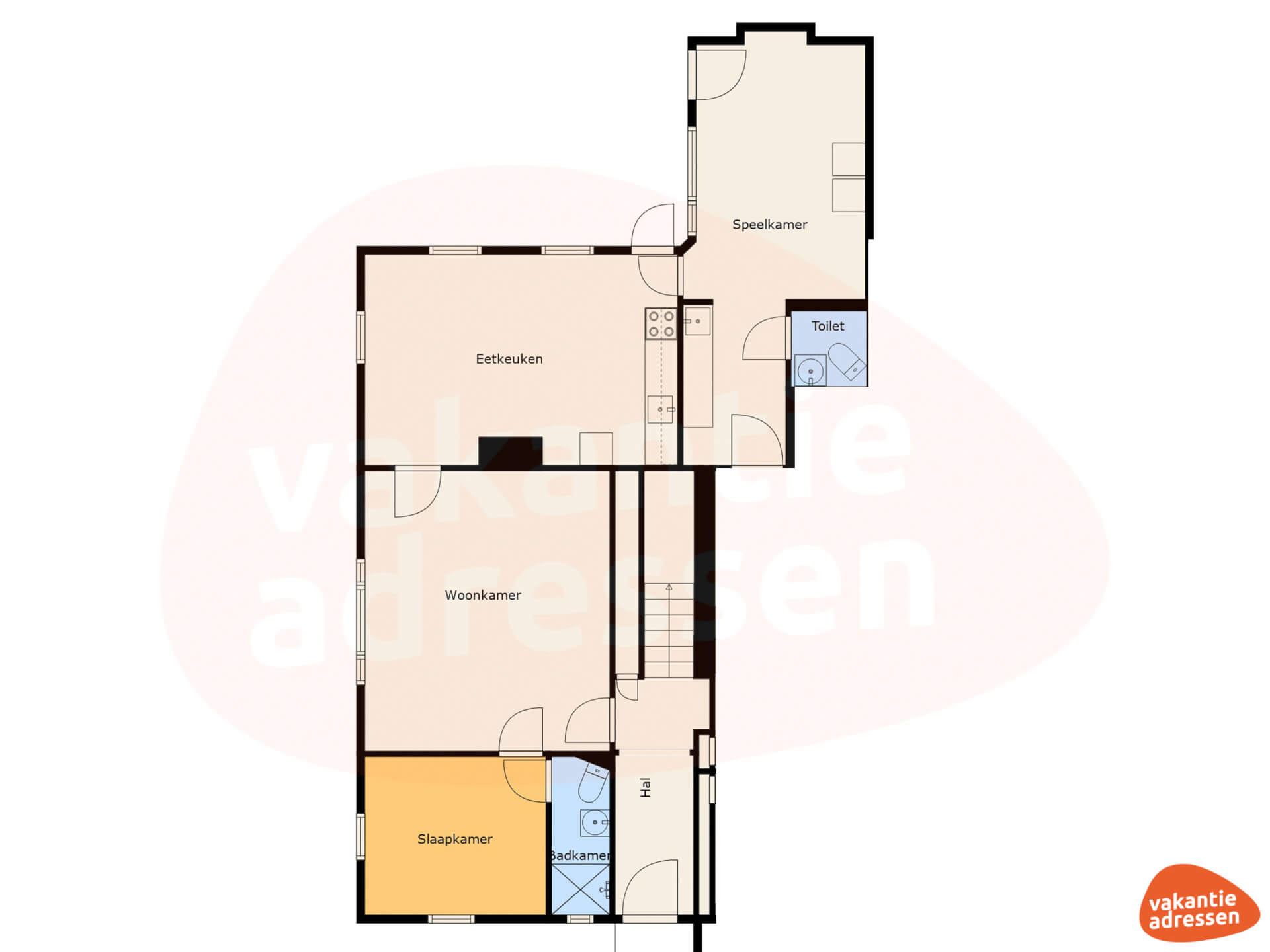 Op de begane grond bevindt zich één van de zes slaapkamers. Deze slaapkamer is voorzien van twee 1-persoons bedden. Aangrenzend bevindt zich een badkamer met douche, toilet en wastafel. Op de eerste verdieping zijn vier slaapkamers te vinden met tevens een tweede badkamer met toilet, douche en wastafel. In één van de slaapkamers bevindt zich een stapelbed, de andere kamers zijn voorzien van 1-persoons bedden of 2-persoons bedden. Voor de kleine gasten zijn er een kinderbedje en een ledikant aanwezig. In de bijkeuken kan tafelvoetbal en darts gespeeld worden.