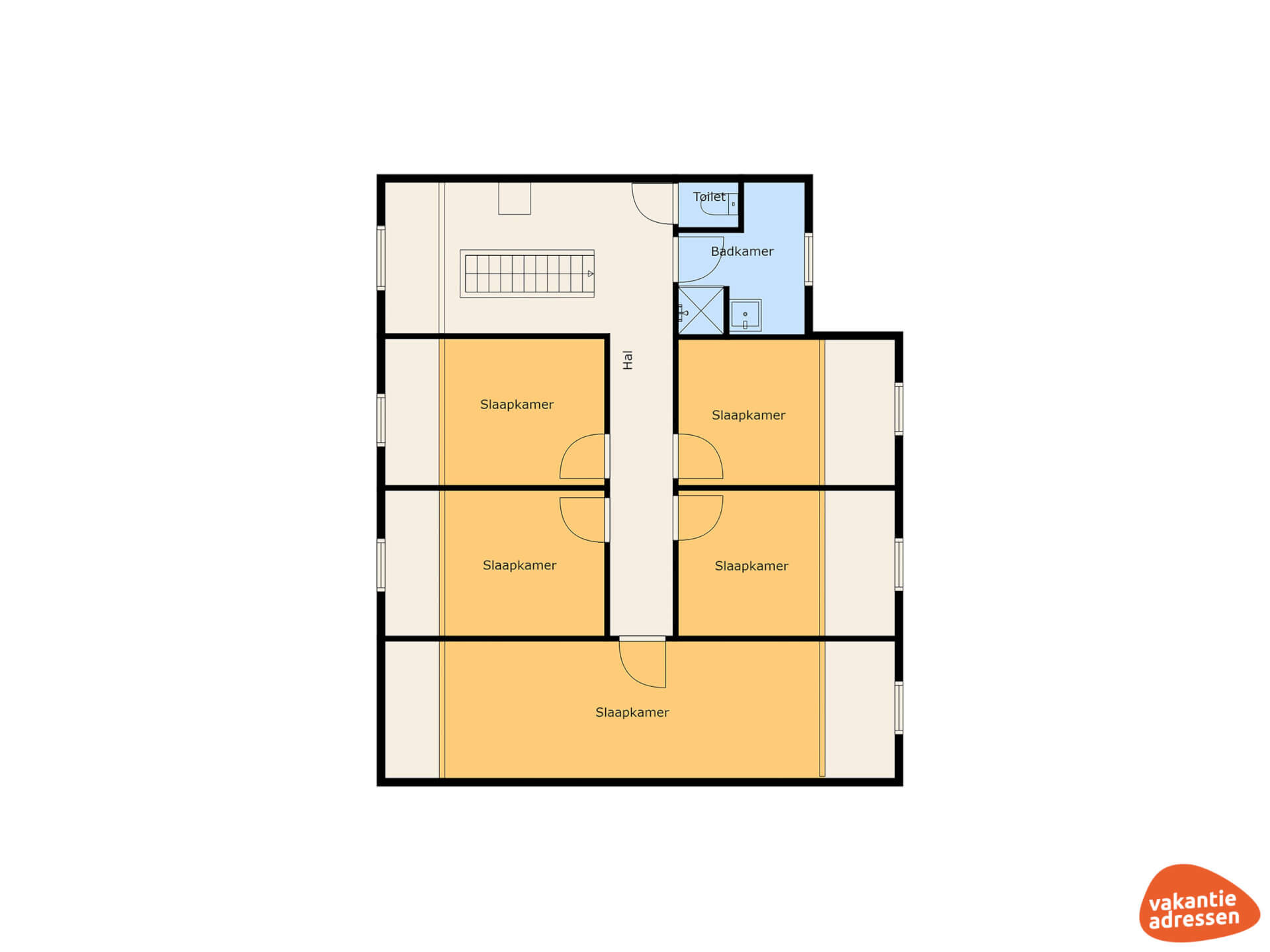 Boven vind je 5 slaapkamers, een badkamer en een toilet. Vier kamers zijn ingericht met 2 éénpersoonsbedden; de vijfde kamer heeft 2 éénpersoonsbedden én 2 stapelbedden –ideaal voor een gezin met kinderen. In totaal zijn er 2 badkamers met douche en aparte toiletruimtes.