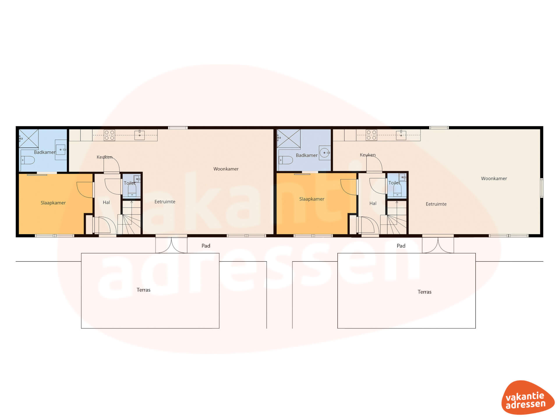 Het voordeel van het huren van 2 vakantiehuizen is dat je beschikt over een dubbele woonkamer/keuken en de groep zich hierdoor eenvoudig kan opsplitsen. Het is goed om te zeggen dat het niet mogelijk is om met 16 personen in één vakantiehuis te eten en/of verblijven, hiervoor zijn de vakantiehuizen te klein.
