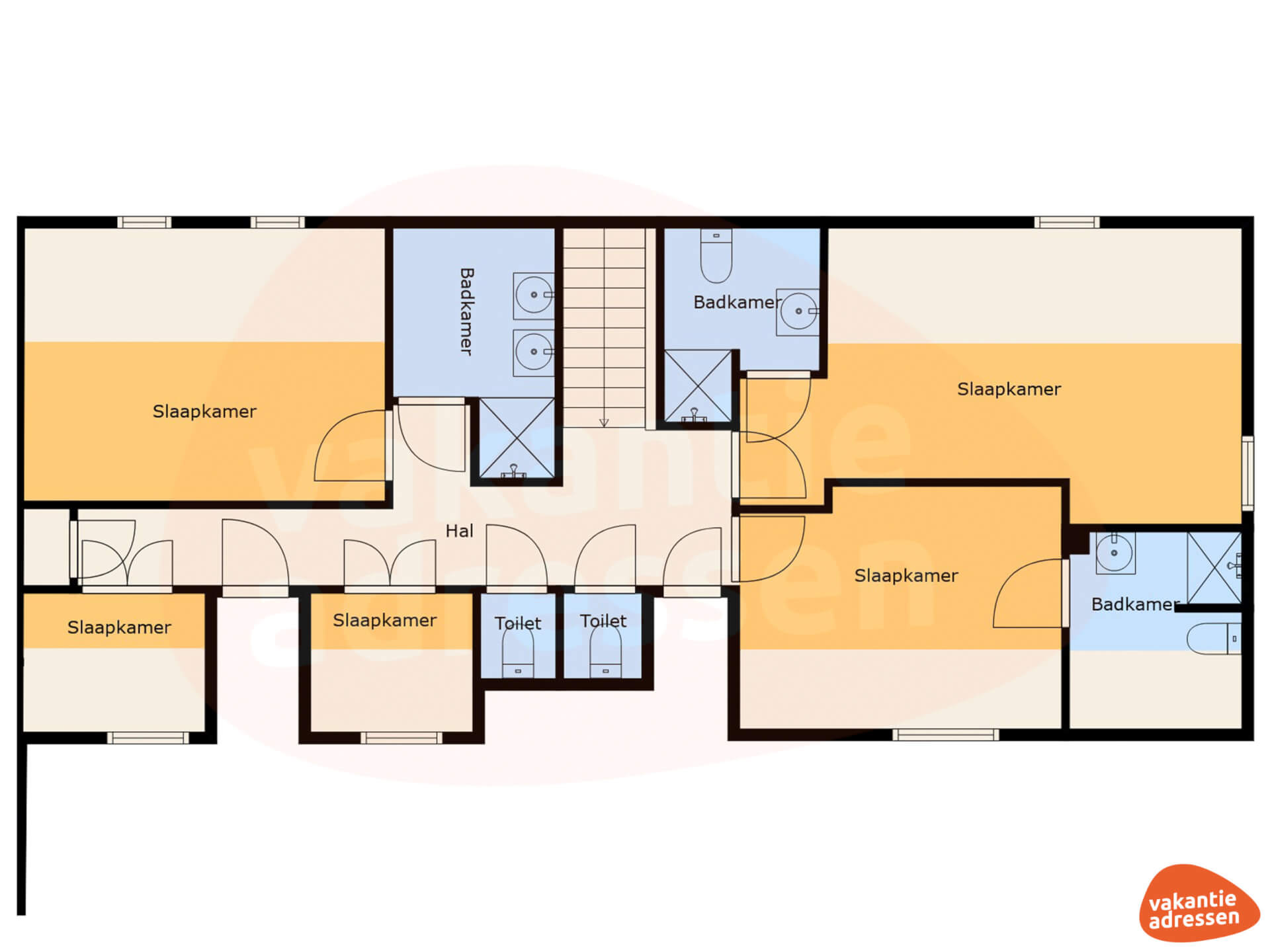 Op de begane grond bevinden zich twee slaapkamers met aangelegen badkamers. Beide slaapkamers zijn drempelvrij en geschikt voor rolstoelgebruikers. Op de eerste verdieping bevinden zich de overige drie slaapkamers én twee bedstedes. Een 4- en 2-persoons slaapkamer zijn voorzien van 1-persoons bedden. De derde slaapkamer is voorzien van een 2-persoonsbed. Alle slaapkamers hebben aangelegen badkamers met een douche en wastafel. Op de gang bevinden zich twee separate toiletten.