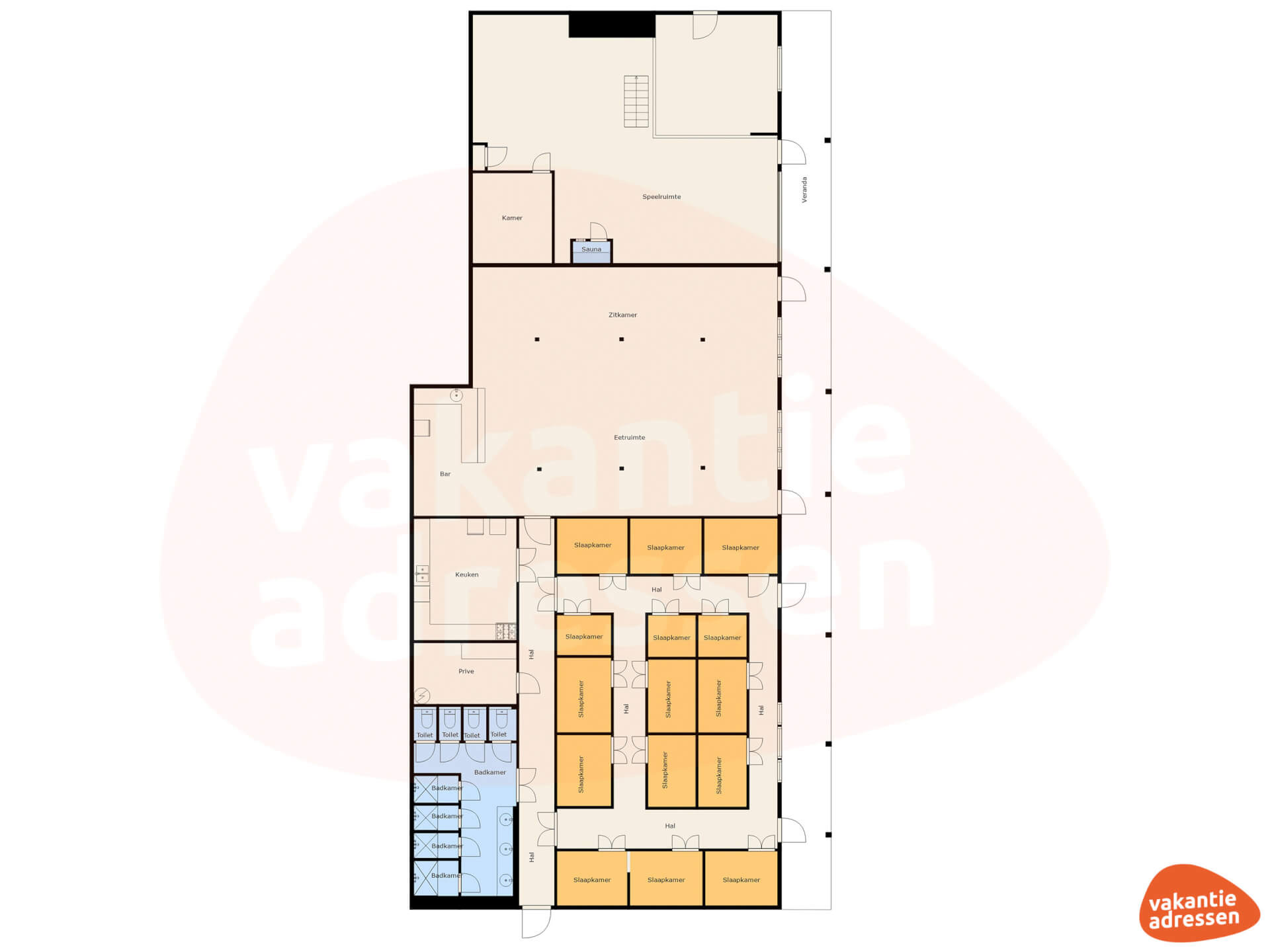 De gelijkvloerse accommodatie is voorzien van een ruime multifunctionele leefruimte met een knusse zithoek en verschillende tafels met stoelen waar je met de hele groep gezellig samen kunt eten. De moderne keuken is van alle gemakken voorzien zoals een groot 6-pitsgasfornuis met bakplaat, oven, magnetron, vaatwasser, koelkast en vriezer. Een maaltijd maken voor de groep wordt hier kinderspel. Na het eten even gezellig aan de bar hangen en de dag doornemen onder het genot van een kopje vers gezette koffie, een waardevol moment samen. Naast de verblijfsruimte is er een speciale speelruimte gemaakt. Dit geheel verwarmde walhalla voor kinderen is erg ruim en heeft o.a. een klimrek, een glijbaan, een tafeltennistafel, een pooltafel, een heuse bioscoop en een grote tafel om lekker te kunnen tekenen of knutselen en waar de ouders een oogje in het zeil kunnen houden.
