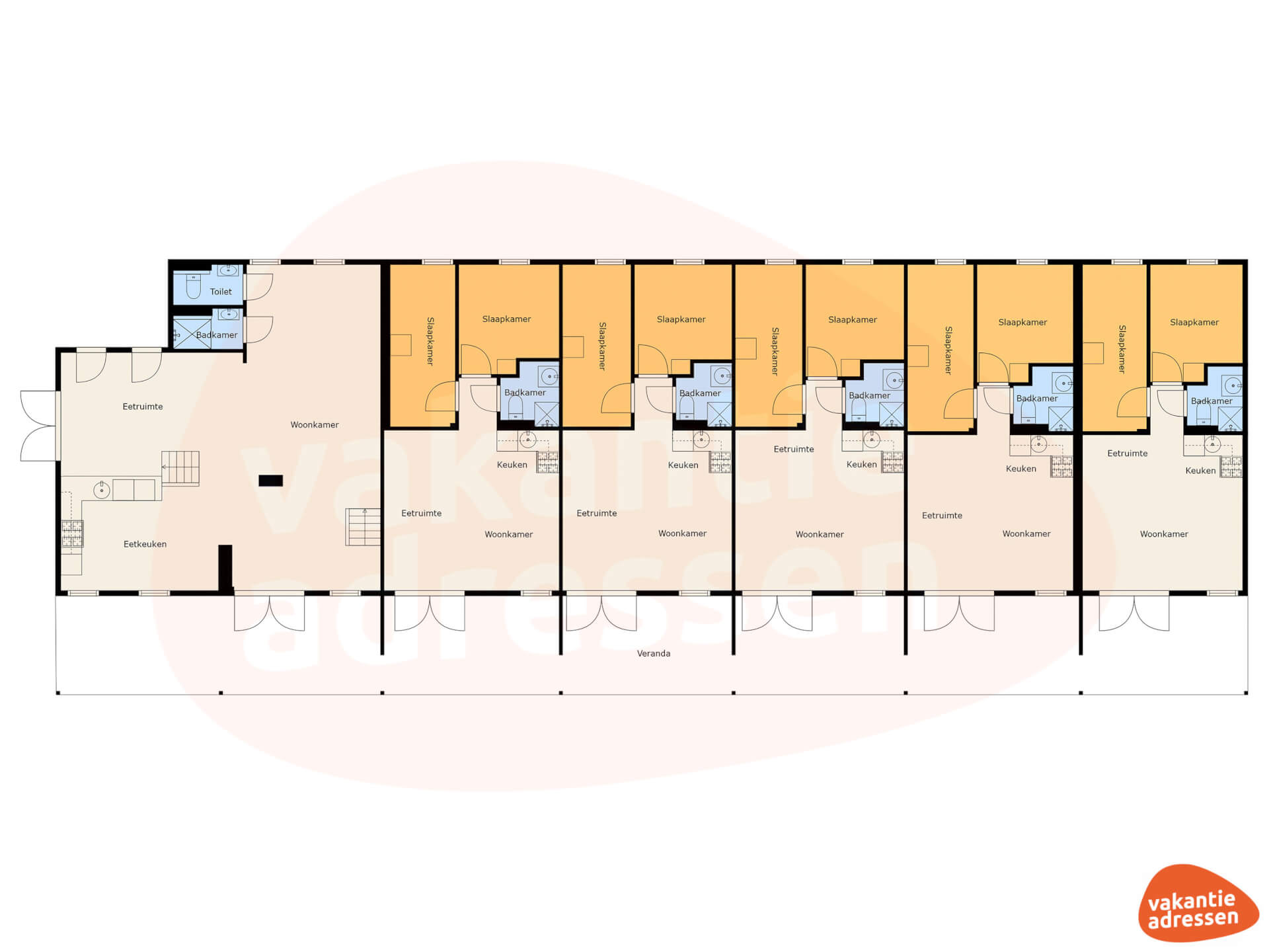 Dit vakantieadres is voorzien van 10 slaapkamers en bestaat uit een groepsverblijf in combinatie met vijf 4-persoons appartementen die naast elkaar liggen. Gezellig samen zijn combineren met de privacy van je eigen volledig ingerichte appartement. Het groepsverblijf heeft een kinderhoekje en een grote gezamenlijke ruimte met keuken, zithoek en eetgedeelte voor 20 personen. Ieder appartement heeft twee slaapkamers, een badkamer en woonkamer met zithoek, eettafel en keukentje. Ideaal voor families met kinderen die toch hun eigen privacy en rust willen hebben.