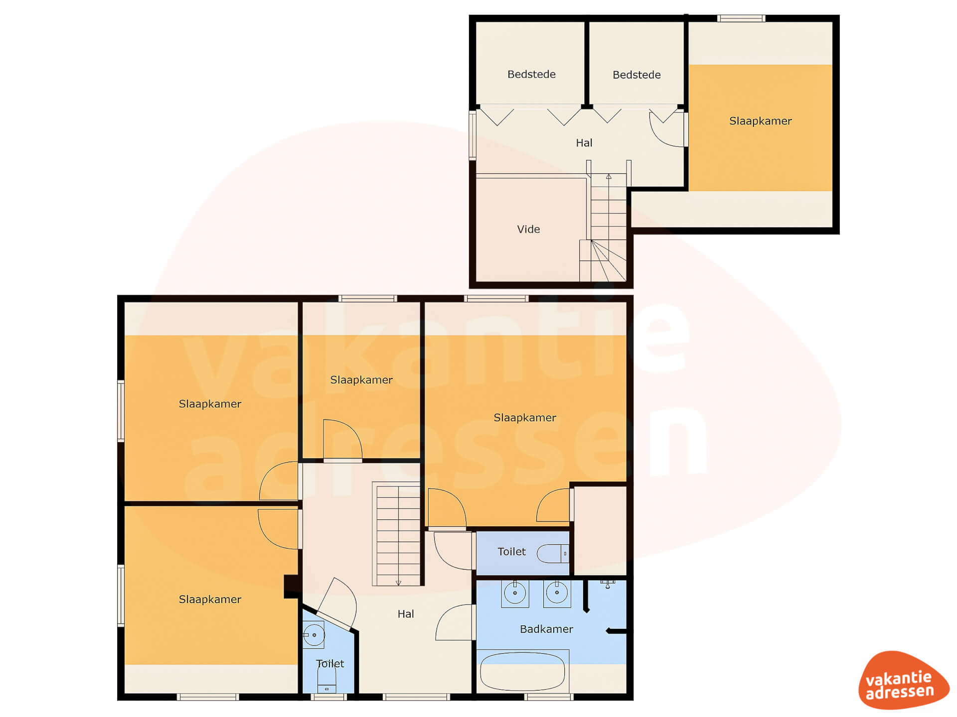 De groepsaccommodatie is in totaal voorzien van 9 slaapkamers, 2 bedstedes en 4 badkamers, verdeeld over twee huizen. Op de begane grond van het grote huis bevinden zich een 2-persoons slaapkamer en twee badkamers met douche, toilet en wastafel. Voor mindervaliden is het prettig te weten dat in de sanitaire ruimtes handgrepen zijn geplaatst voor een beter houvast. De overige 14 slaapplekken van het grote huis liggen op de eerste verdieping. Er zijn 5 slaapkamers voor 2 personen en twee grote 2-persoons bedstedes. Verder vind je boven nog een badkamer met douche, ligbad en 2 wastafels, net als een separaat toilet. Het naastgelegen 6-persoons vakantie-/slaaphuis beschikt over 3 slaapkamers en een badkamer. Ook kun je je hier even terug trekken in je eigen woonkamer. Het voordeel van een apart slaaphuis is dat een gedeelte van de groep kan gaan slapen terwijl een ander gedeelte van de groep nog een heerlijk glas wijn van eigen bodem drinkt.