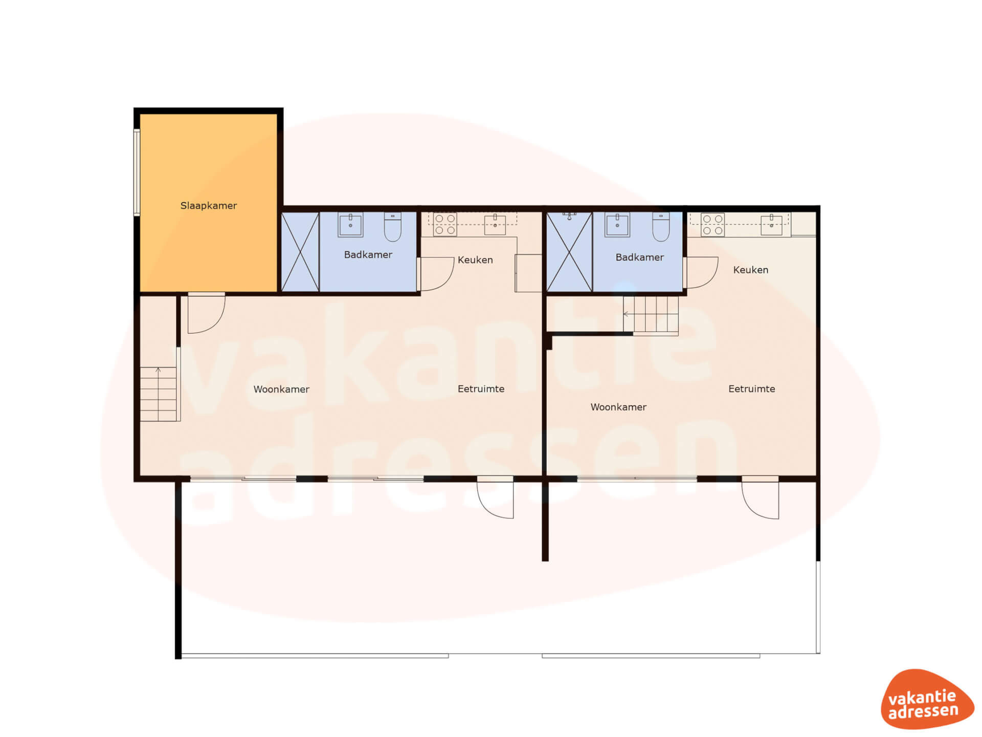 Het voordeel van het huren van 2 appartementen is dat je beschikt over een dubbele woonkamer/keuken en de groep zich hierdoor eenvoudig kan opsplitsen. De appartementen zijn niet intern geschakeld, buitenom kun je van het ene naar het andere appartement lopen. In het grootste appartement is het mogelijk om met 14 personen te eten en/of verblijven.