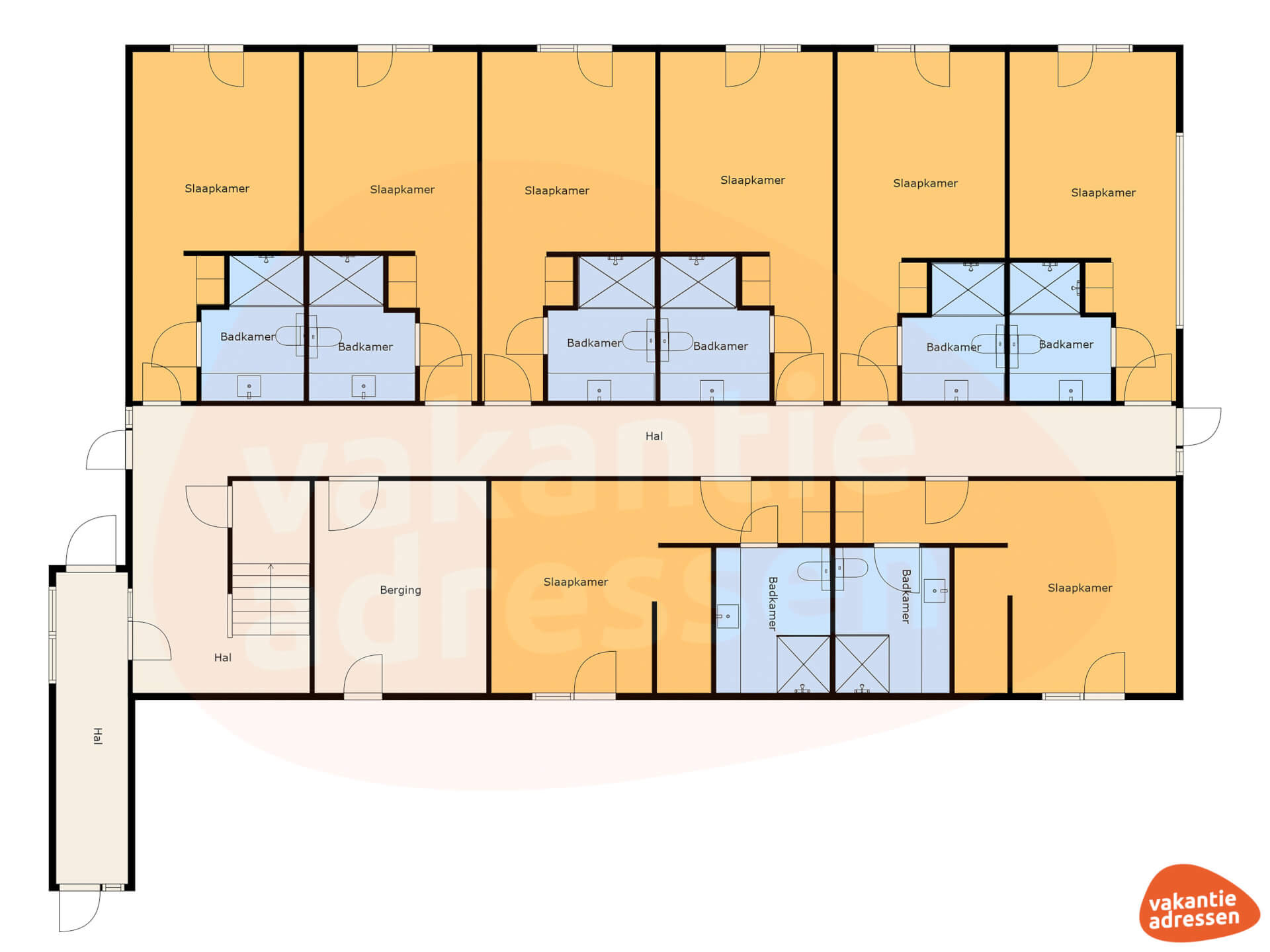 Slaapkamer 7: 1x 2-persoonsbed + 2-persoons stapel bedstee + douche, toilet en wastafel