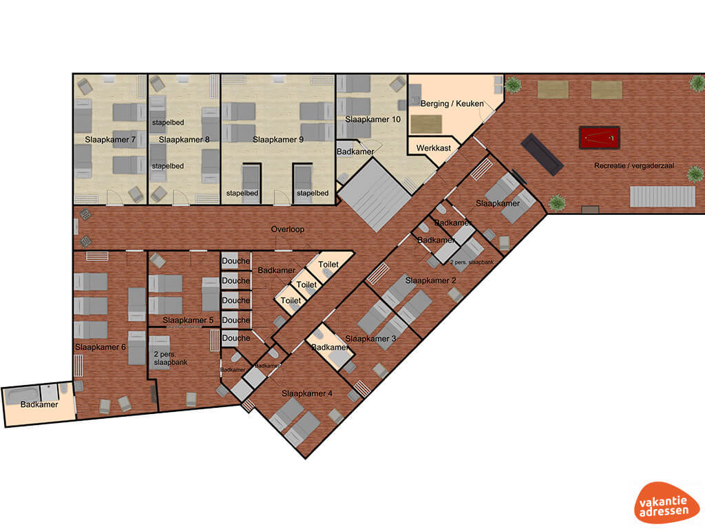 Een fantastische lokatie! Wij hebben deze lokatie geboekt voor ons bedrijfsuitje. De lokatie is prachtig, bedden zijn top, kamers leuk ingericht, meer dan voldoende toiletten en douches. De keuken is zeer geschikt om voor een groep te koken, alles wat je nodig hebt is aanwezig. De speelruimte is ook leuk, tafeltennistafel, biljart en heel veel spelletjes. De muziekinstallatie werkt goed. Het contact met de lokatie was heel prettig, alles is goed geregeld! Dank voor alles.