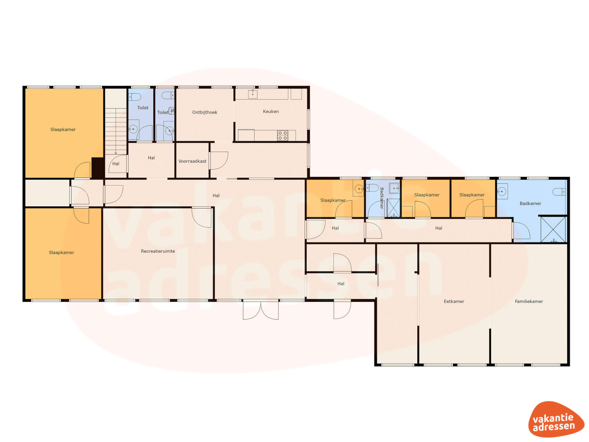 Het huis beschikt over 5 slaapkamers, waaronder 2 ruime kamers voor 6 personen en 3 kamers voor 2 personen. Voor de sanitaire voorzieningen is er volop comfort: in de kelder bevindt zich een grote ruimte met 3 douches en 4 wastafels, terwijl de begane grond nog 2 moderne badkamers biedt met douche, toilet en wastafel. Daarnaast is er een apart toilet aanwezig. Een kinderstoel en kinderbed maken het huis extra geschikt voor gezinnen. Het geheel is rook- en huisdiervrij, zodat je verzekerd bent van een frisse en schone omgeving.