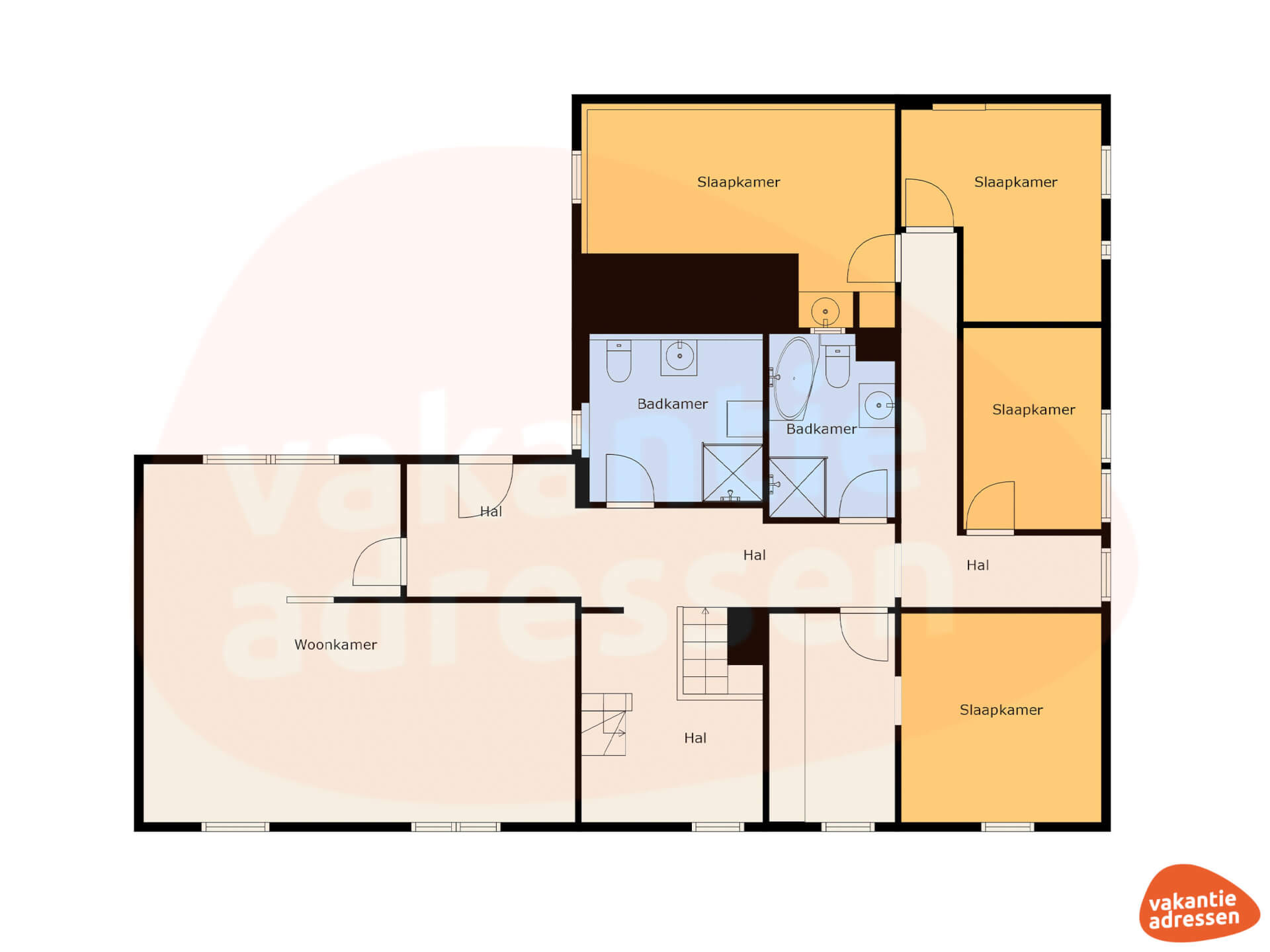 De 6 slaapkamers en 3 badkamers zijn verdeeld over de twee verdiepingen. Op de eerste verdieping vind je vier 2-persoonskamers en twee badkamers. Op de tweede verdieping bevinden zich twee 4-persoonskamers en een badkamer. Alle slaapkamers zijn gezellig ingericht en voorzien van comfortabele bedden, de badkamers zijn erg ruim en voorzien van douche, toilet en wastafel. Bovendien heeft een van de badkamers op de eerste verdieping een ligbad, voor een momentje van totale ontspanning.