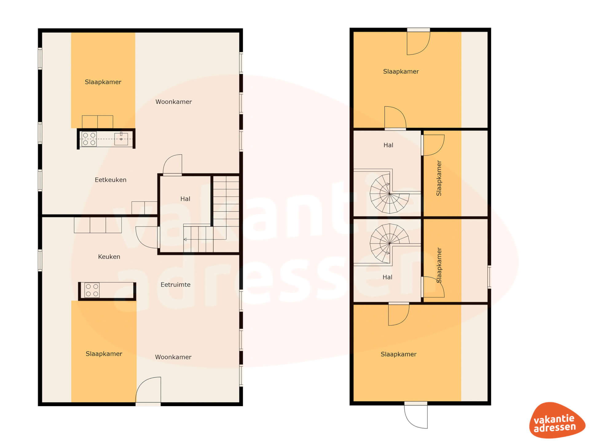 De 6 slaapkamers en de 4 badkamers zijn verdeeld over twee vakantiewoningen en twee suites. De vakantiewoningen hebben beneden een luxe badkamer, voorzien van douche, toilet en wastafel. De slaapkamers bevinden zich boven en zijn verschillend ingericht. Zo is er in 1 vakantiewoning een kamer met twee 1-persoonsbedden en een kamer met vier 1-persoonsbedden. De andere vakantiewoning heeft een slaapkamer met twee 1-persoonsbedden en een slaapkamer met een 2-persoonsbed en twee 1-persoonsbedden. Zo kun je altijd precies díe kamer kiezen, welke het beste bij je past, ideaal! Beide suites hebben beneden een separate badkamer en toiletruimte, boven bevinden zich de slaapkamers met daarbij een ruime living. Deze zijn voorzien van vier 1-persoonsbedden. Ook zijn beide suites voorzien van een eigen uitgebreide keuken. Overal zie je de authentieke details terug komen, op subtiel wijze vermengd met moderne luxe en comfort. Een ultieme plek om jezelf weer helemaal op te laden voor een nieuwe dag vol activiteiten met je familie of vrienden.