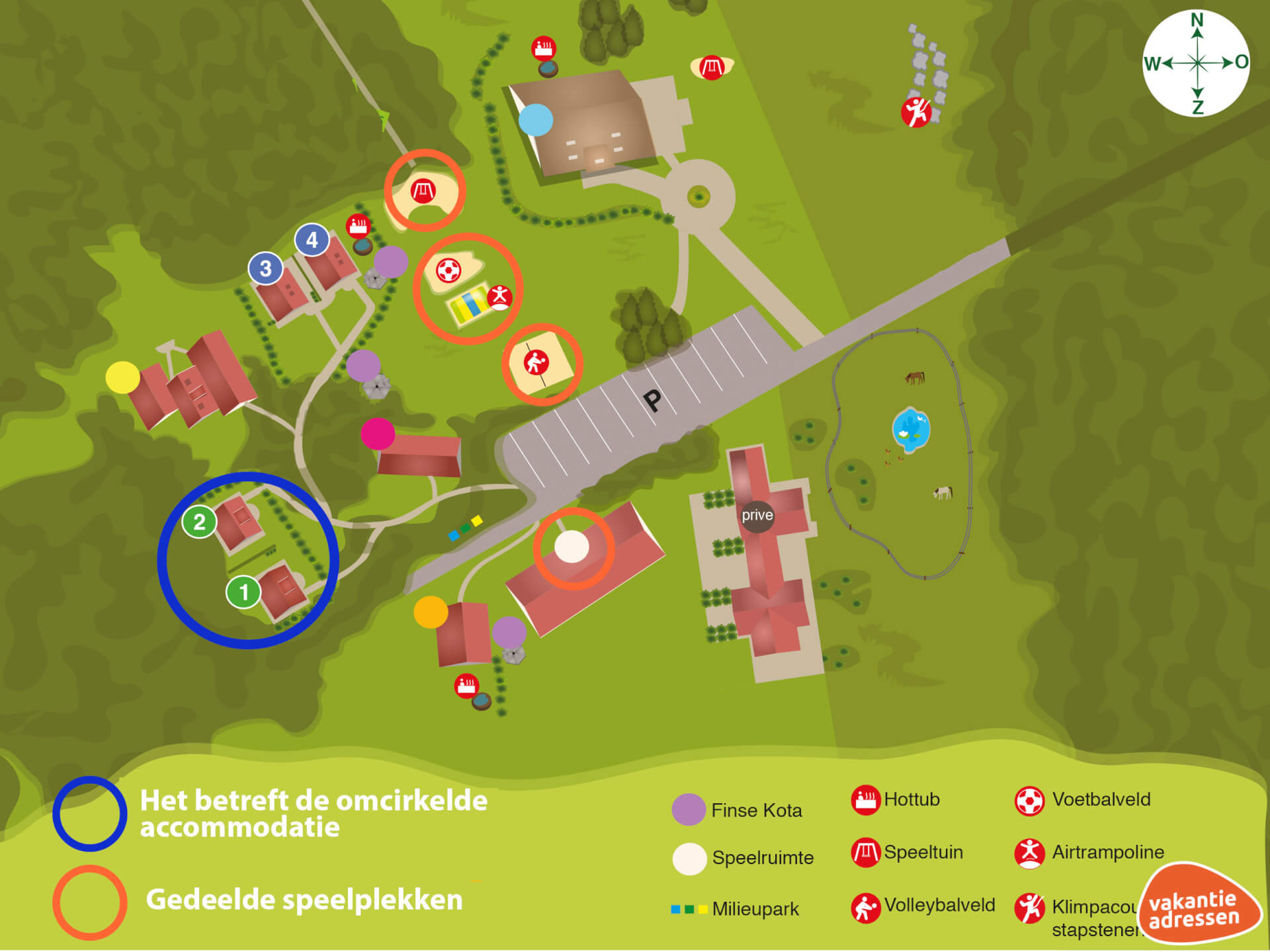 Bij de accommodatie bevindt zich een grote speel- en dierenweide met pony’s, eenden en kippen. Op de speelweide zijn onder andere schommels, een trampoline, duikelstangen, een tafeltennistafel en wipwap te vinden. De overdekte speelruimte is voorzien van een tafeltennistafel, dartspel en airhockey. Deze faciliteiten worden gedeeld met de andere aanwezige gasten. De omgeving biedt een grote variëteit aan wandel- en fietsroutes.
