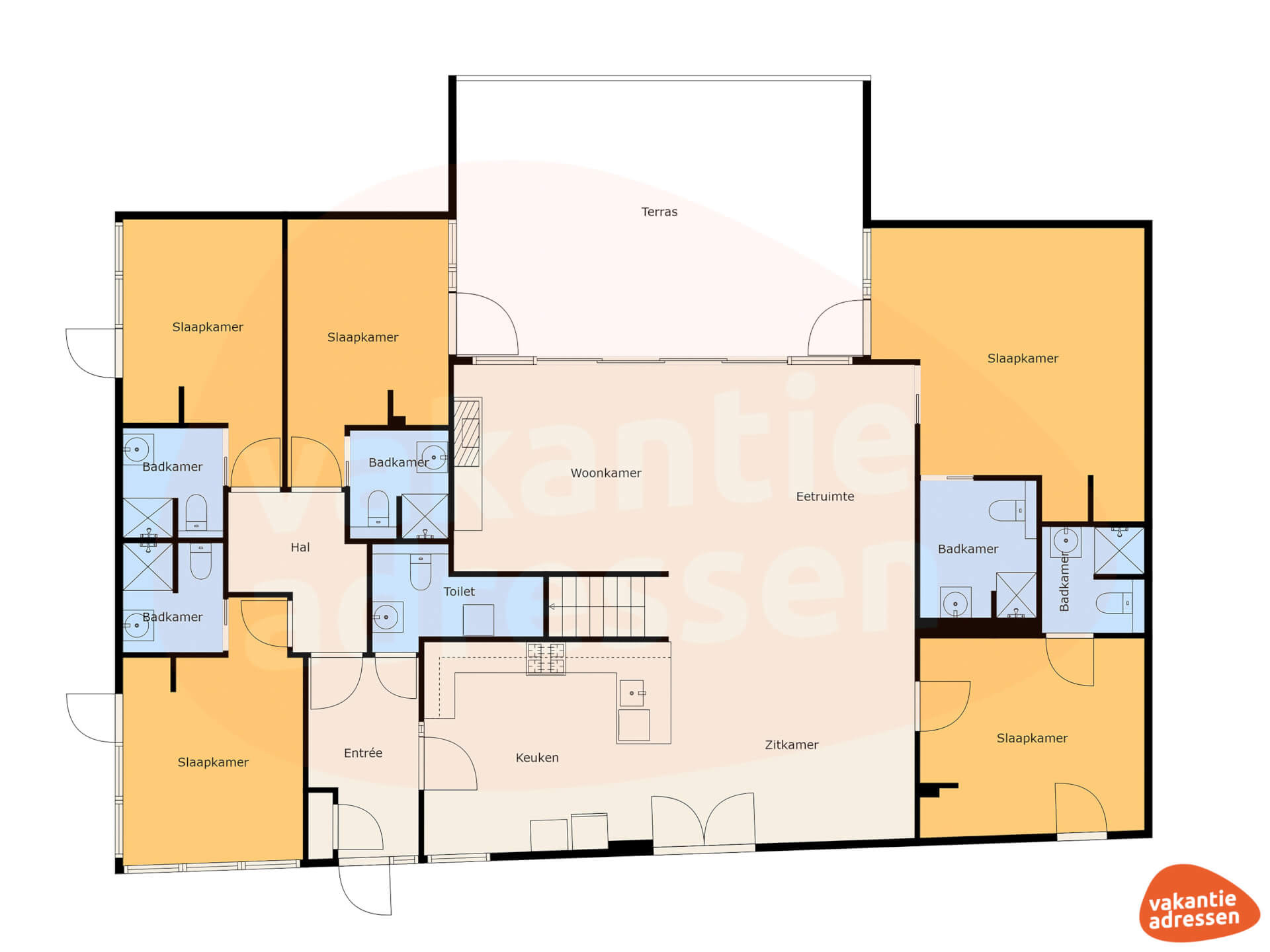 Geniet van een goede nachtrust in één van de zeven royale slaapkamers. Vijf hiervan bevinden zich op de benedenverdieping en hebben de luxe van een eigen badkamer en een directe toegang tot buiten. Voor gasten met een verminderde mobiliteit is een slaapkamer met een hoog-laagbed en een rolstoelvriendelijke badkamer aanwezig, deze is drempelloos en heeft aangepast sanitair. Boven zijn de andere twee slaapkamers en een kamer met TV voor de kinderen te vinden, net als een ruime badkamer met douche, toilet en wastafel.