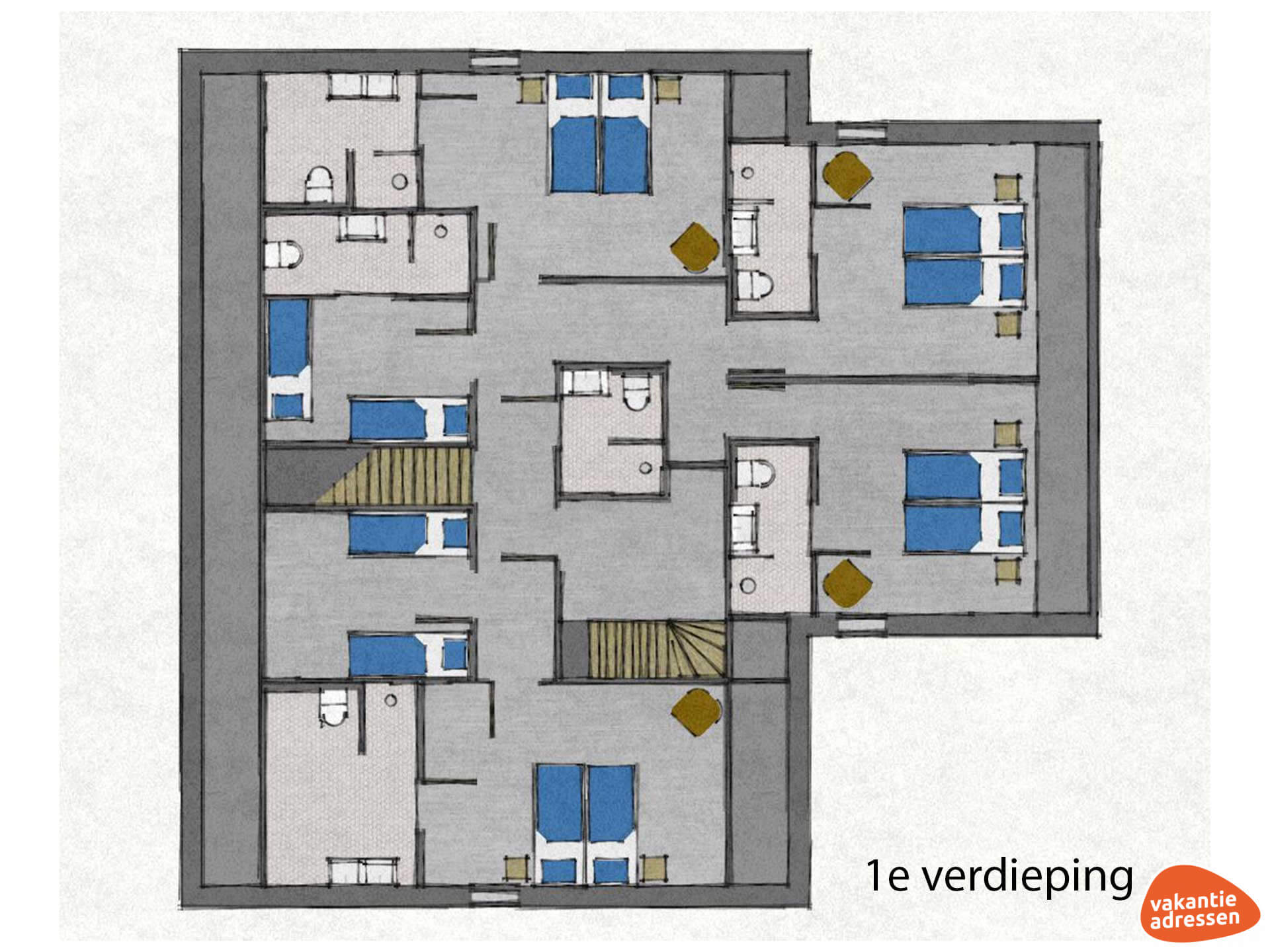 - Alle slaapkamers zijn voorzien van eigen douche, toilet en wastafel