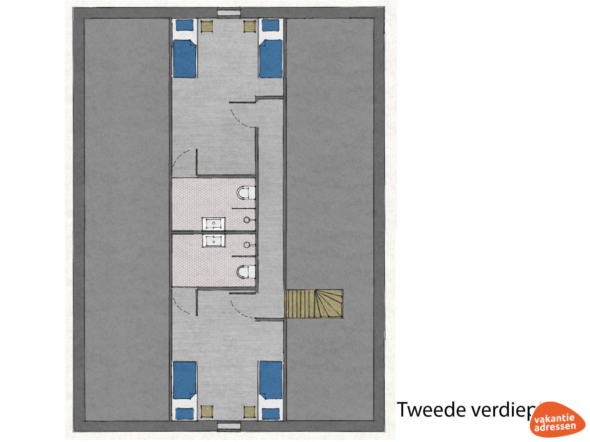 Slaapkamer 4: 2x 1-persoons boxspringbed + douche, toilet en wastafel