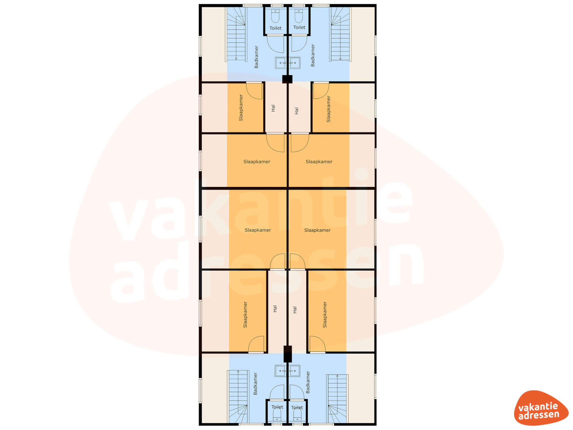 De badkamers bevinden zich op de begane grond. 2 Slaapkamers grenzen aan de badkamer en zijn door de ruime opzet tevens geschikt voor mindervaliden. De overige 8 slaapkamers bevinden zich op de eerste verdieping en zijn voorzien van box-springbedden en twee stapelbedden.