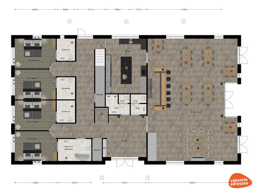 In de sfeervolle woonkamer zijn meerdere zitplekken en is er genoeg ruimte om met zijn allen samen te zitten, vanuit waar je uitkijkt over de uitgestrekte weilanden en omliggende bossen. De ruime fauteuils nodigen uit om je je heerlijk in te nestelen en te genieten van de aangename warmte van de kachel, tijdens het kijken van een leuke serie op TV. De professionele horecakeuken met grote rvs afzuigwand is een ware droom voor de kookliefhebber. Je kunt met vrienden en familie lekker koken, je beschikt over veel werkruimte op het eiland, een 8-pits gasfornuis, grote oven, magnetron, snelle vaatwasser en voldoende koeling. Aan de mooie houten eettafels kun je samen genieten van de met liefde gemaakte maaltijd en urenlang natafelen of vervul de rol van barkeeper achter de eigen bar, wat garant staat voor gezellige momenten. De groepsaccommodatie heeft een eigen berging met een was-en droogcombinatie, ideaal om tussendoor even je lievelings-outfit of handdoeken op te frissen.
