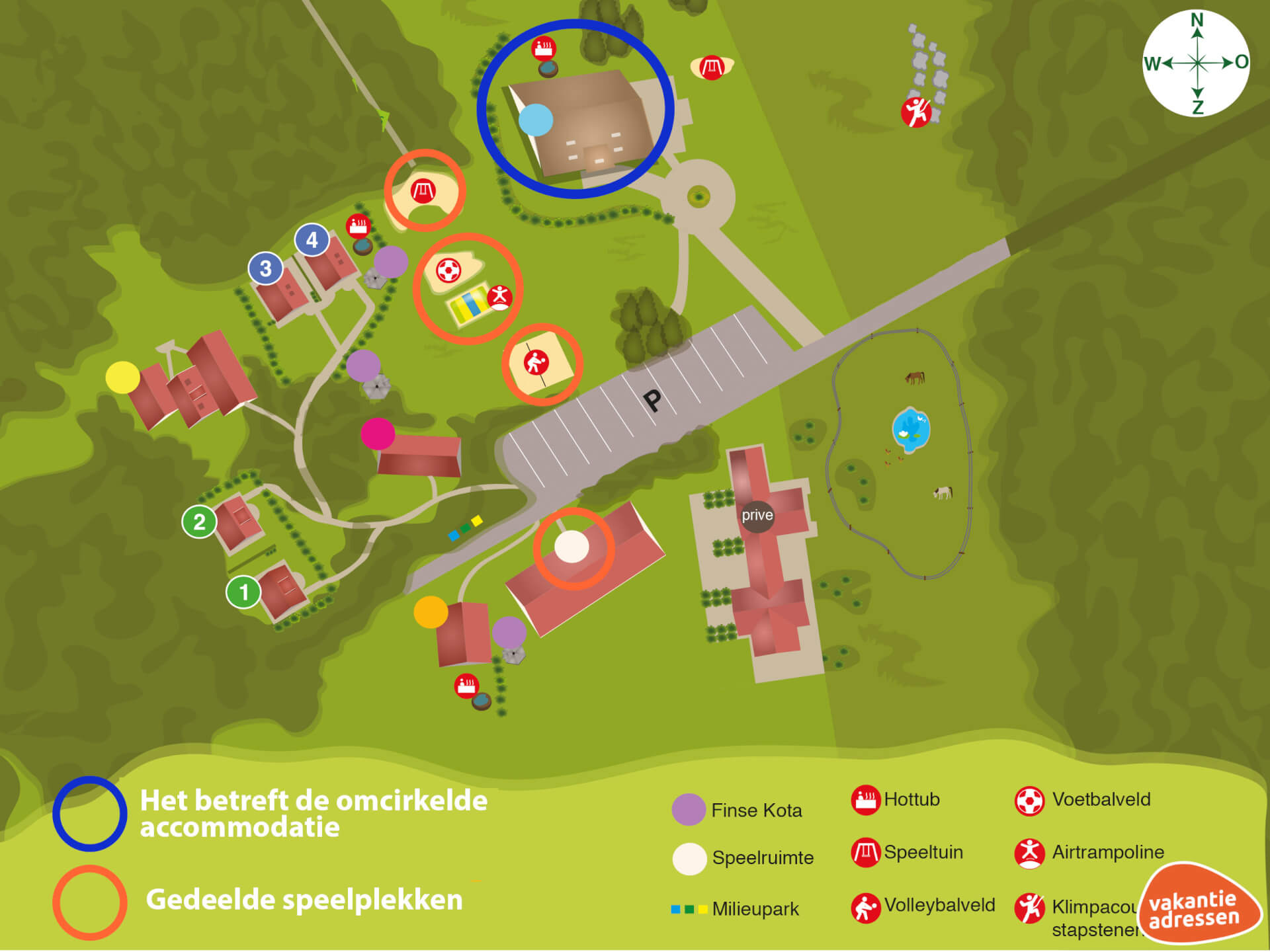 Bij de accommodatie bevindt zich een grote speel- en dierenweide met pony’s, eenden en kippen. Op de speelweide zijn onder andere schommels, een trampoline, duikelstangen, een tafeltennistafel en wipwap te vinden. De overdekte speelruimte is voorzien van een tafeltennistafel, dartspel en airhockey. Deze faciliteiten worden gedeeld met de andere aanwezige gasten. De omgeving biedt een grote variëteit aan wandel- en fietsroutes. Volop vertier!